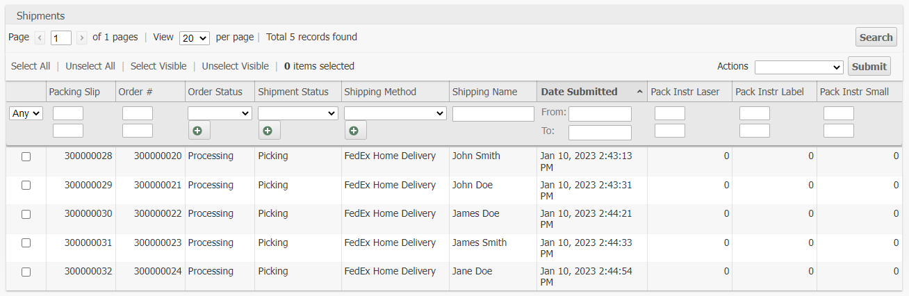 Shipment Grid Columns