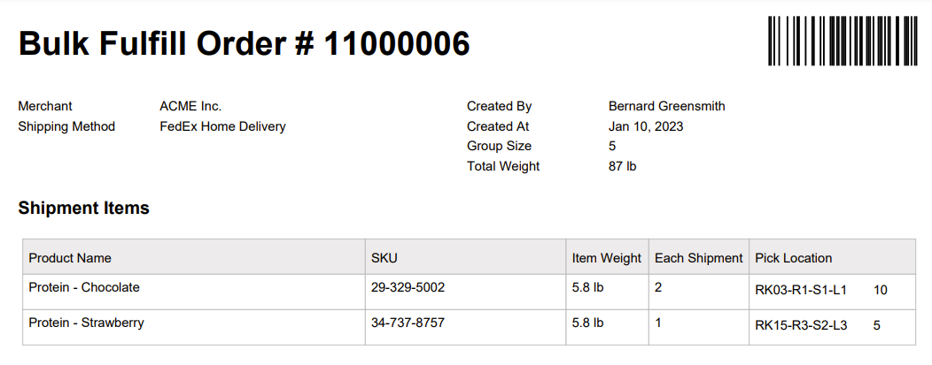 Bulk Fulfill Orders (henceforth referred to as BFOs for brevity) are used to pick and process multiple shipments that contain the same set of items in the same quantities. The workflow for a BFO is optimized to reduce otherwise repetitive picking and packing operations that would be incurred were the same shipments to be picked as a batch.