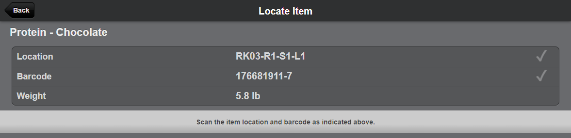 - When picking a BFO the System will direct the user to the first item to pick. Once at the location, the user will be directed to scan the Location barcode and the SKU's barcode.