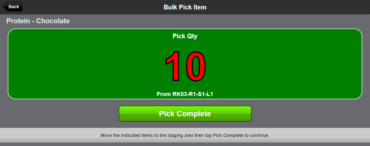 - Once Location and SKU are confirmed the System will direct the user to pick a quantity from the current Location. The User should place these items in a cart or a staging area. A location from which the Shipments will be packed and finished. Once this pick has been placed in the cart/staging area, confirm this pick.