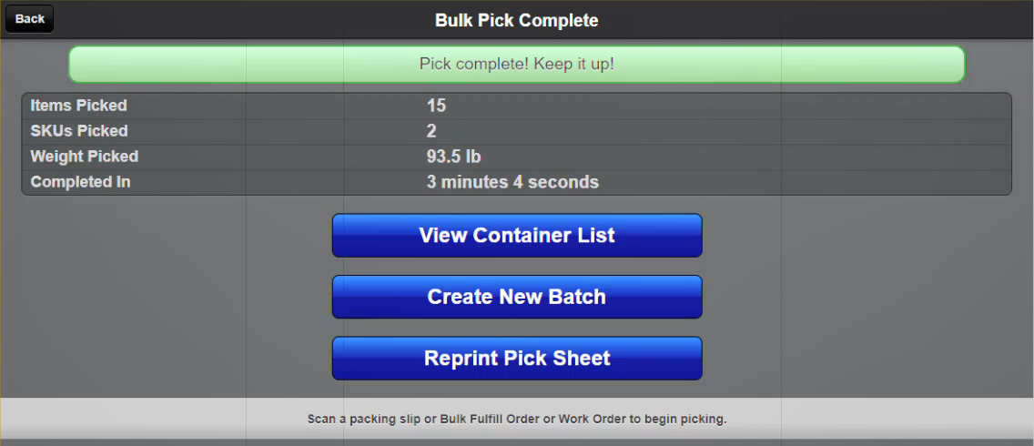 - The User will be directed to repeat Steps 2 and 3 until each Pick Item has been picked. Once all Picks are confirmed the screen will show the Pick completion statistics.