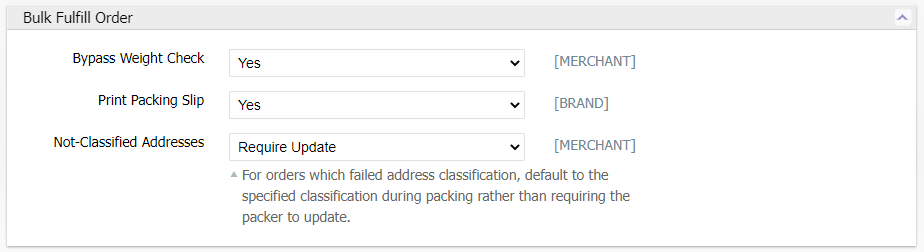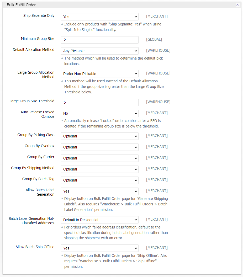 The following configuration fields are found at System > Configuration > Warehouse > Operations > Bulk Fulfill Order.