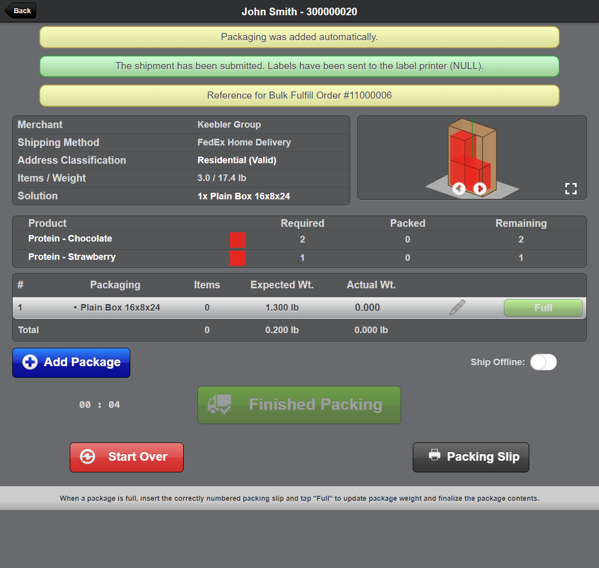 - The shipment will be automatically submitted, so tapping "Finished Packing" is effectively automatic.