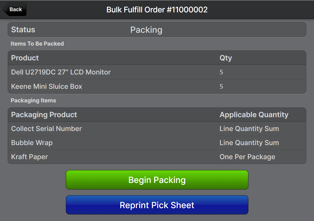 - Scan the BFO Pick Sheet. This barcode scan will open the starting page to pack the BFO Shipments which displays the SKUs and quantities that were picked and are to be packed.