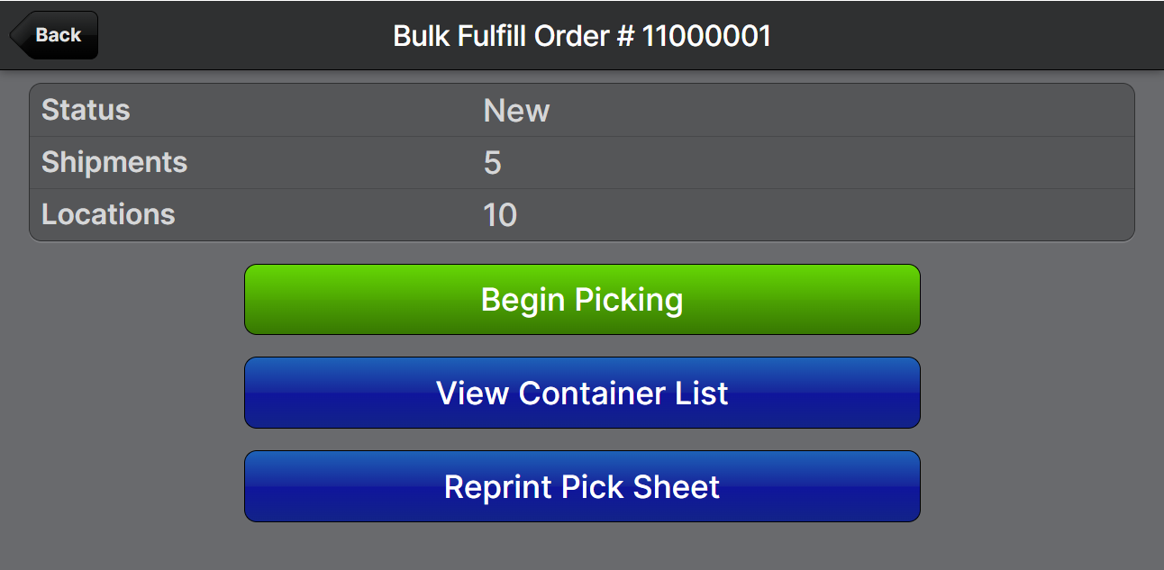 Upon clicking Submit, the system will create the BFO and generate the BFO Pick Sheet. The shipments are all advanced to Picking status, similar to when shipments are added to a Picking Batch.