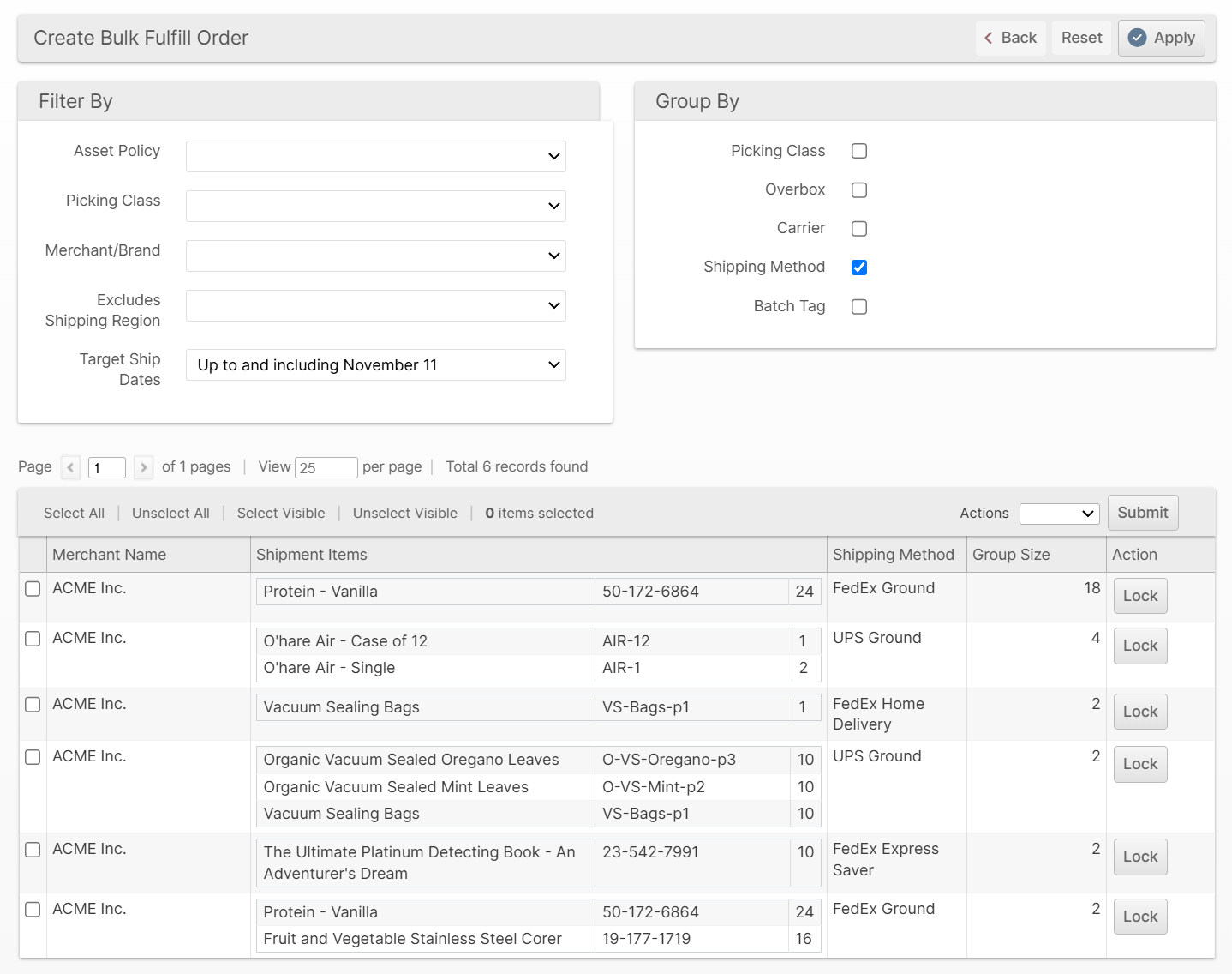 While on the Create Bulk Fulfill Order page with no Group By options selected, you will notice there is a Lock or Unlock button on each row and a Lock and Unlock mass action.