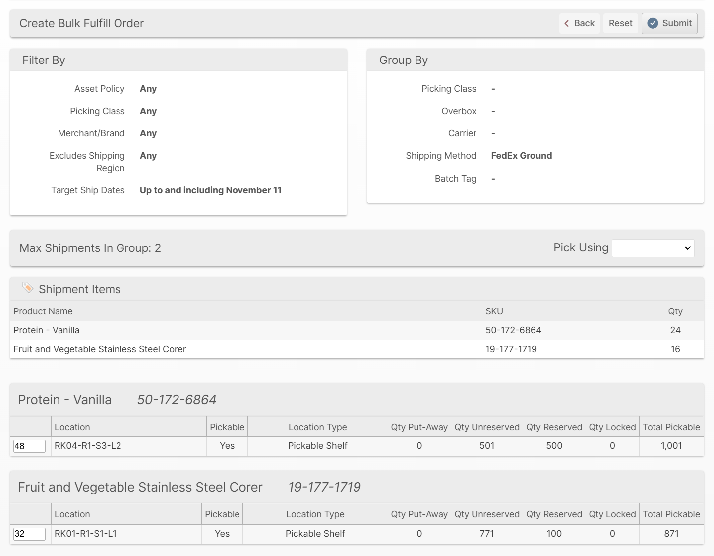 Click on a row to advance to the next step toward creating a BFO. This page displays information about the parameters used to form the group, the maximum number of these shipments that can be added to the new BFO and a section for each pickable SKU so that you can customize the pick locations.