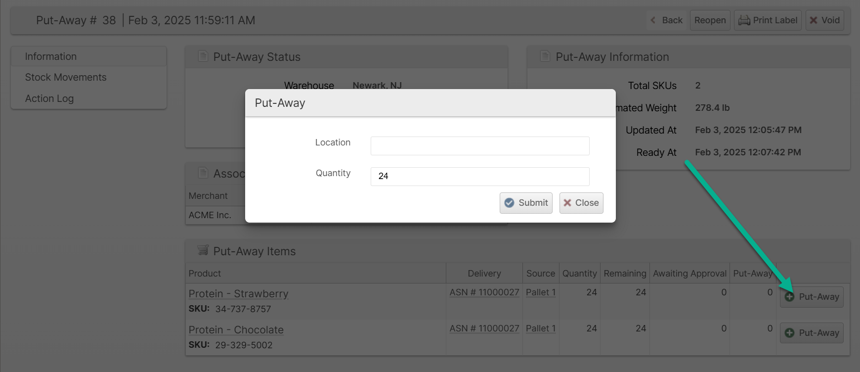 - Click the Put-Away button on your chosen item row.