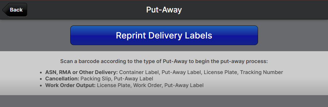 The types of labels that can be scanned include Container Labels, Put-Away Labels, License Plates, Packing Slips, and Tracking Numbers.- navigating to Operations > Put-Aways and using the grid to locate
