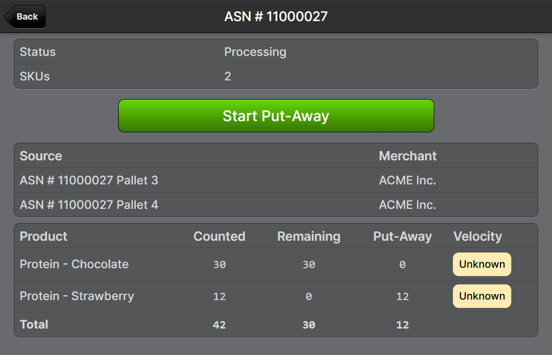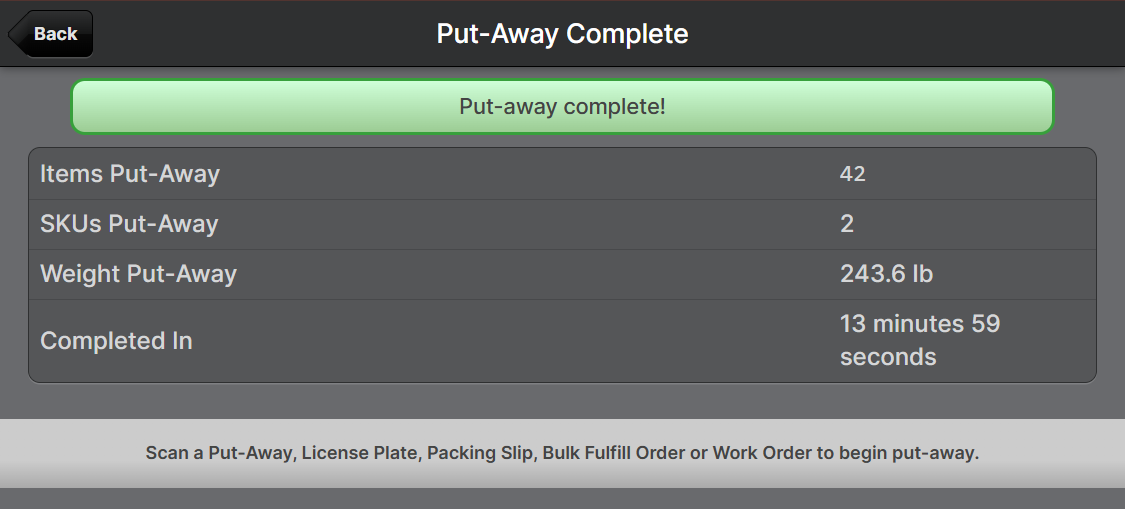 - Tap Start Put-Away to begin processing.
