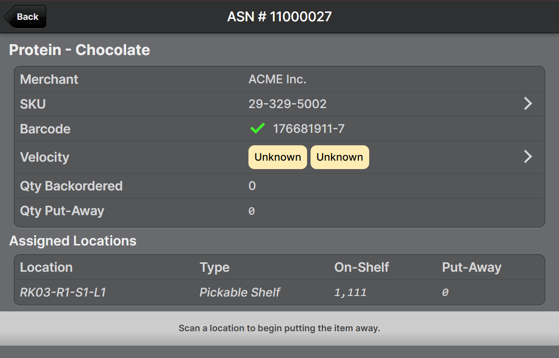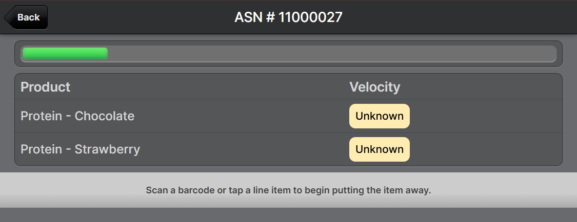 Tap the Velocity row to view more information about the recent velocity of the product, so you are better informed about the demand for this particular product. See Product Velocity for more information. Then tap Back to return to the previous screen.- Use the counter to enter the amount which is to be put in the current location.