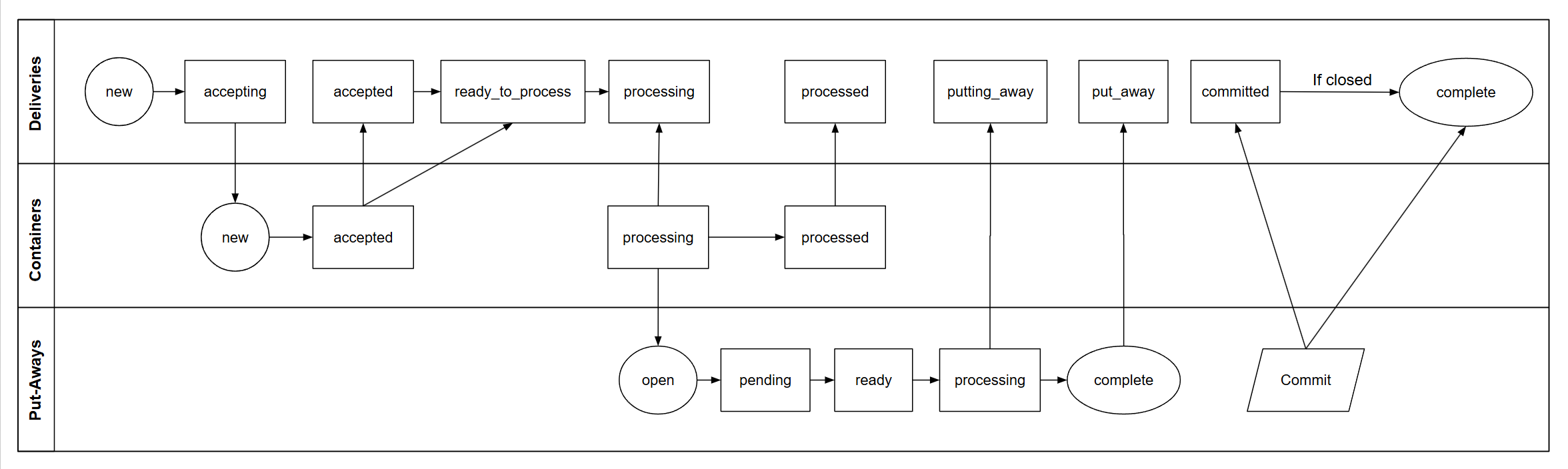 Put-Aways directly impact the status of the ASNs, RMAs and Other Deliveries to which they are associated as depicted in the following diagram: