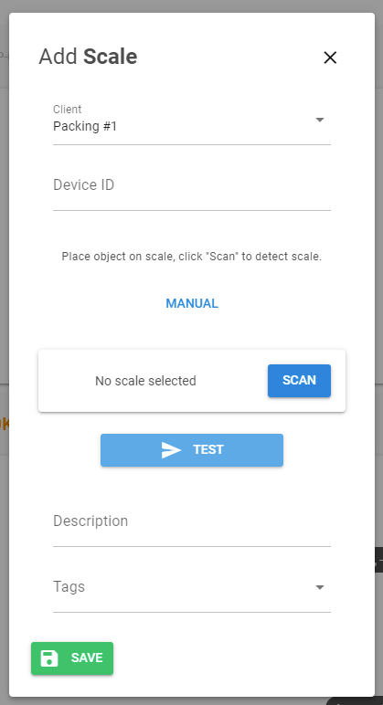 - Scan — if the selected client has a scale or scales connected with a weight reading, clicking Scan will automatically detect it and return a list of scales and their weight readings.