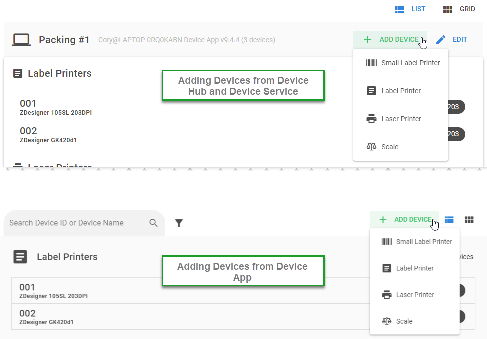 With a Device App connected and displayed on Device Hub, you can either add devices from the Device Hub or from the Device App on the machine that is connected to the printers/scales.