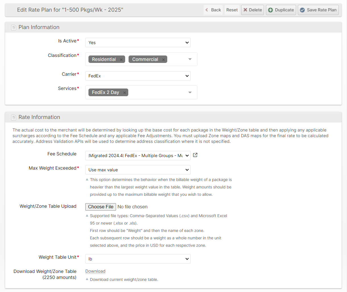 There is a Residential Surcharge fee type, so if the residential surcharge is a flat fee, you do not need to upload two separate tables for Commercial and Residential. In this case, you should upload only one rate plan and add a Residential Surcharge to the Fee Schedule.- Select the Carrier and the Services (only select multiple services if they share the exact same fee structure)