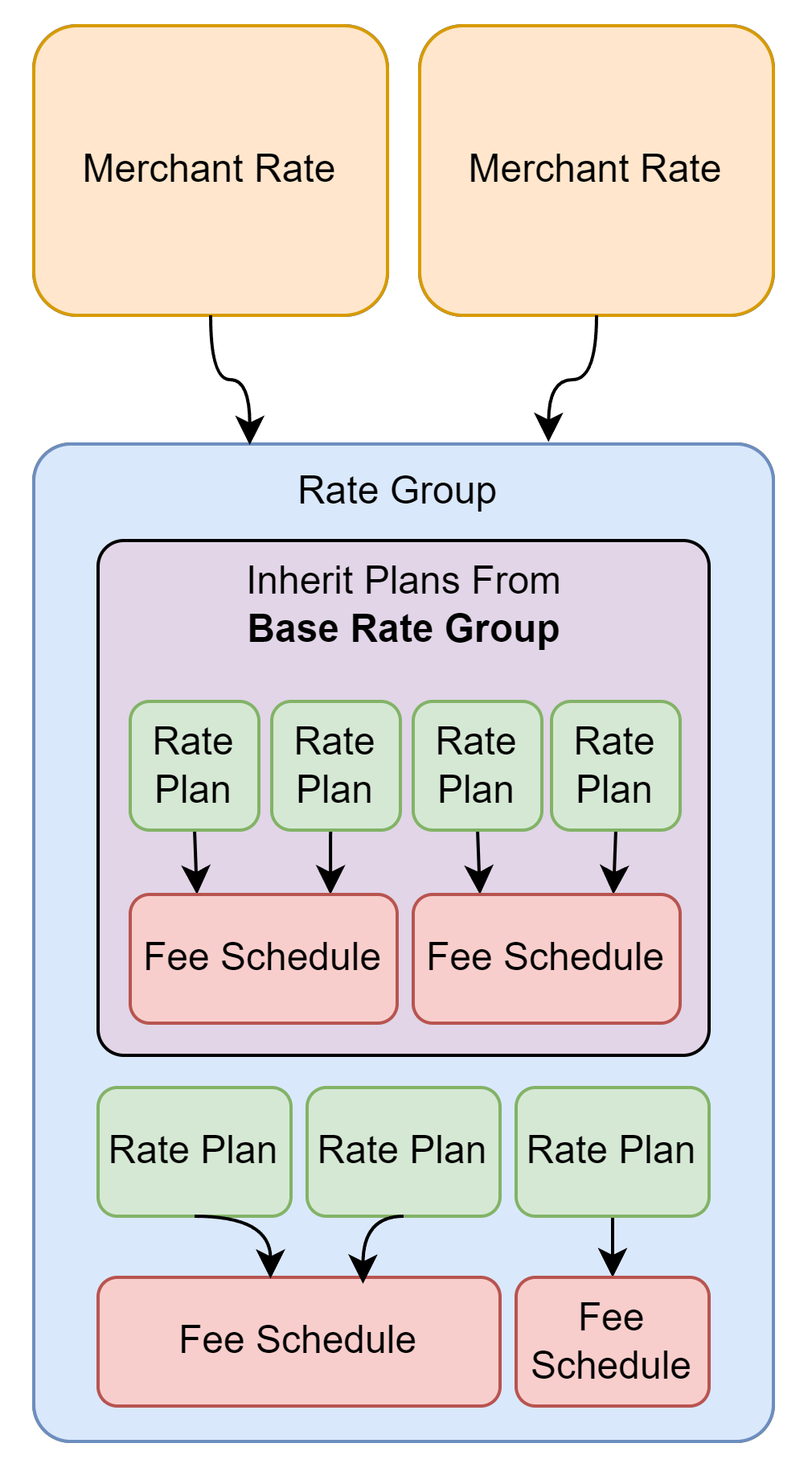 To reduce data duplication and entry overhead, you can use a Base Rate Group and then other Rate Groups may inherit the Rate Plans from this group using the Inherit Plans From option. A Base Rate Group cannot be used directly in a Merchant Rate, so their only purpose is for being referenced by the Inherit Plans From option of one or more Rate Groups.