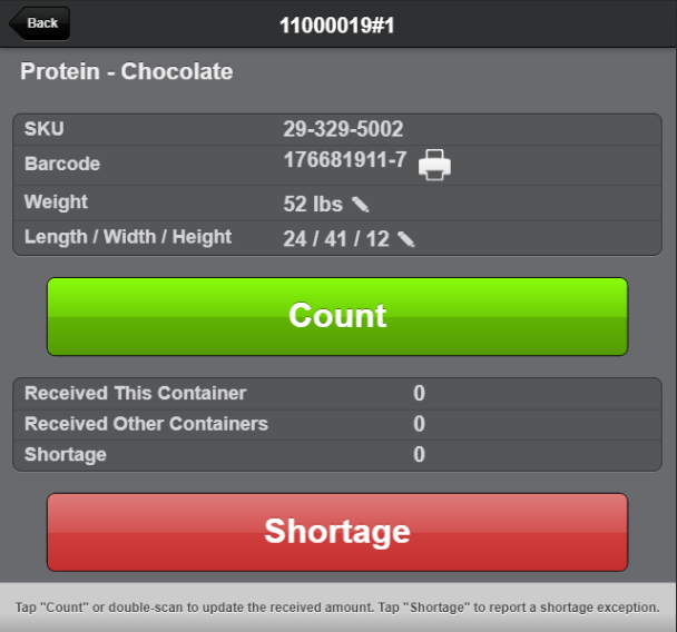 To automatically switch to the Count Screen, users must be on the Processing screen and must perform a Double-Scan by scanning the same product barcode twice within 500 milliseconds of each other. This is similar to the double-click speed on a computer mouse.