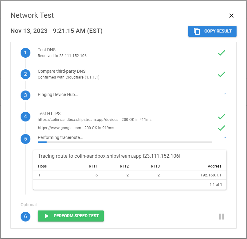 The Device Hub Server and Device App will now allow full network diagnostics from a simple GUI which can be used to determine if a network problem exists locally or externally. The test comprises of DNS tests, network pinging, HTTP requests, traceroutes, and download speed testing.
