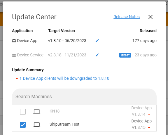 If for any reason, you feel the need to downgrade one or multiple clients to a previous version, the Device App will now allow users to do so using the Device Hub Update Center (previously Upgrade Center). A Target Version may be selected using the edit (pencil) button, and the machines that can update to the target version will be listed (with incompatible machines disabled).