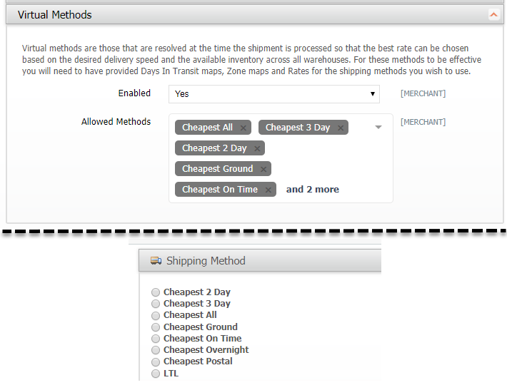 Please note, this feature is disabled by default so it needs to be enabled under System > Configuration > Warehouse > Rating > Virtual Methods before the "Cheapest" methods can be used.