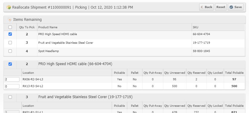 The Choose Locations page now requires you to check which items you wish to update. Changing the pick locations for a Shipment locks the items to that location so that they will not be optimized to the first pickable location which is sometimes undesirable so by being more precise with your pick location updates the system will be better able to optimize pick locations for the rest of the Shipment. Additionally we added a button and a mass-action for "Unlock Pick Locations" so that if you have used Choose Locations you can unlock the locations allowing inventory drops to automatically update the shipments to your newly dropped inventory if appropriate.