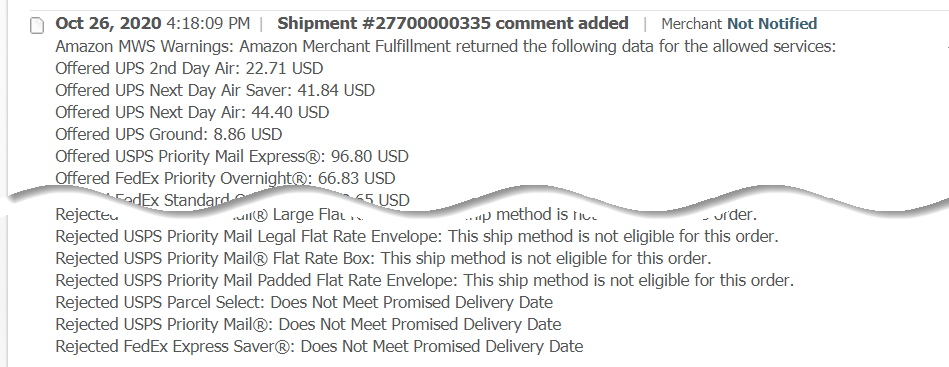 We've added a lot more detail to the order history for Amazon Merchant Fulfillment Services so that you can see every service that was offered and the price as well as every service that was rejected and the given reason.