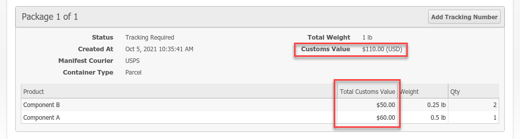 Additionally, the final computed customs values are displayed on the Order page and included in grid export data at the package and package item level so you can easily see and export the same data that was submitted electronically.