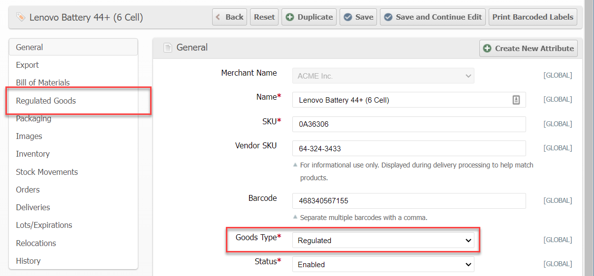 As the applicability of Regulations has broadened we have renamed the goods type "Dangerous Goods/Hazardous Materials" to "Regulated" and "Dangerous Goods" to "Regulated Goods" in the UI. Additionally if the Regulation attribute is not allowed to be edited the user can still create a product but the Availability will be set to Not Available until a Regulation is selected.