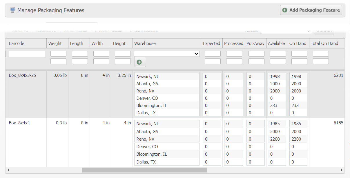 The Packaging Features grid now shows inventory right on the grid so you can easily see what is available and where. Additionally, this view has been added to the Client UI so that merchants can also see the same for the Packaging Features belonging to their merchant account.