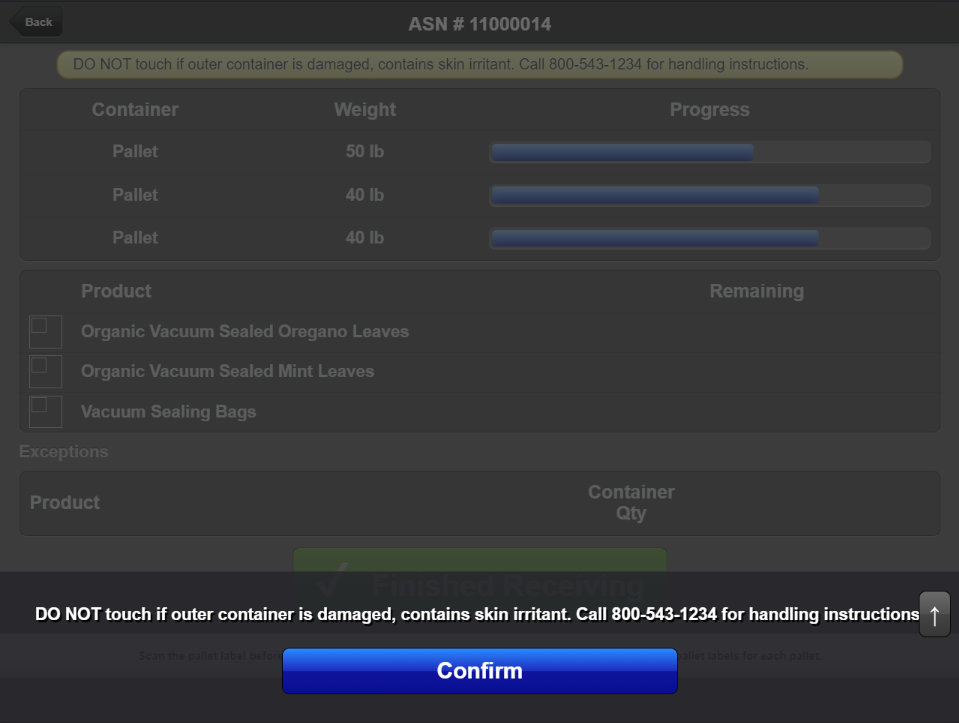 The Processing Comments on ASNs and RMAs are now added to a modal prompt when the user taps 'Begin Processing' or 'Continue Processing' to bring them to the user's attentions more prominently.