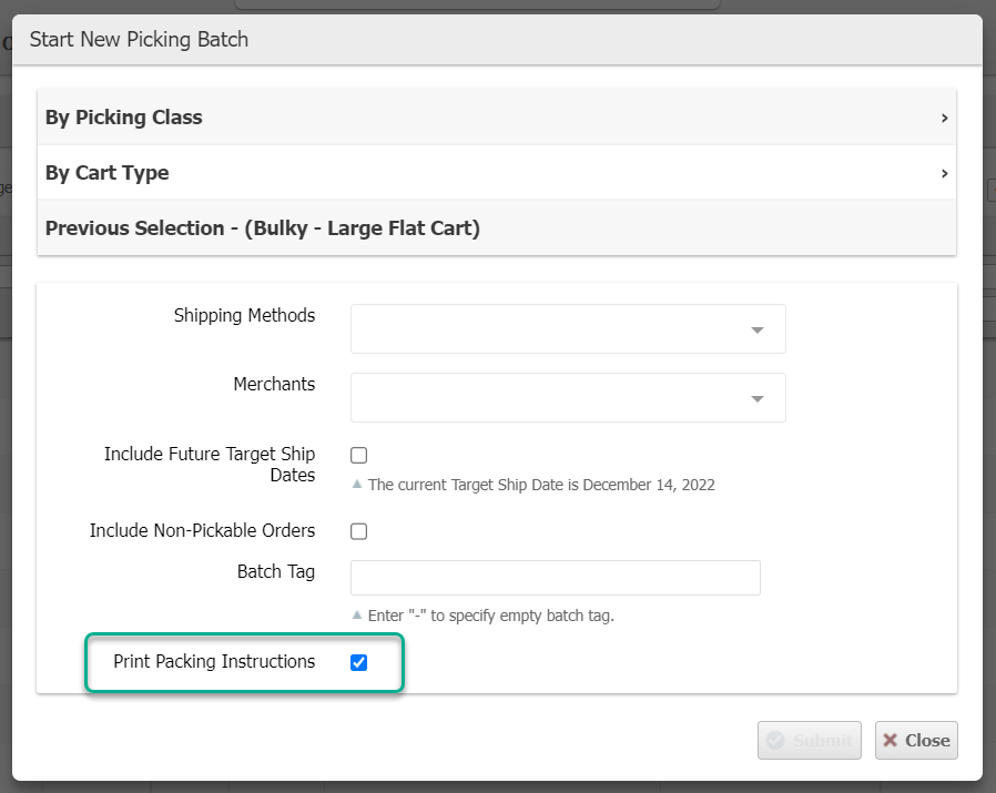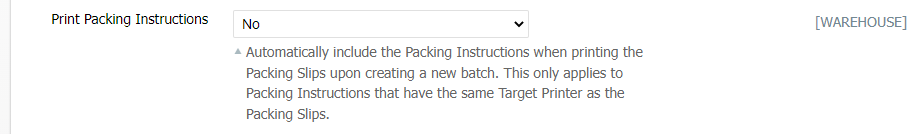 A default for when to Print Packing Instructions during Batching can also be set at the Global and Warehouse scopes in System > Configuration > Warehouse group > Operations tab > Batching fieldset