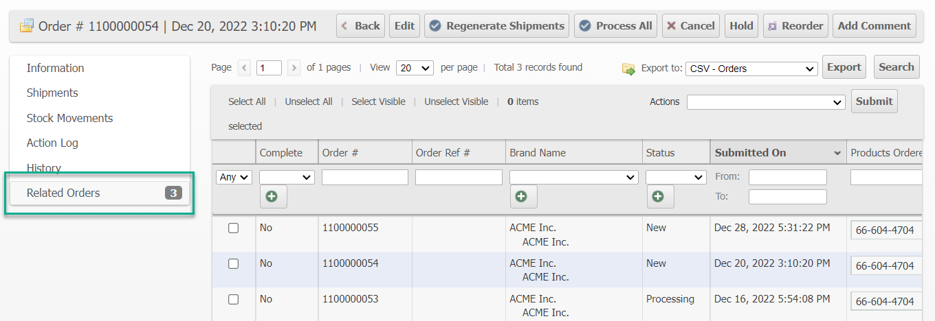 Finding orders from the same customer is now just one click! The Related Orders tab will appear if there are any orders for the same merchant with the same email address or the same country + city + street address. The current order is highlighted in blue and all mass actions and export formats are supported.