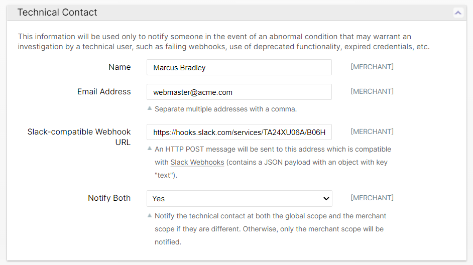 This configuration can be set at both the global and merchant scope. For 3PLs, this means you can easily control whether the notifications are sent only to your internal team, to the merchant's technical contact, or both.