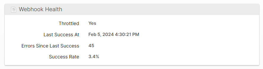 Easily get a picture of the health of your webhooks and see detailed error messages for recent errors. Additionally, repeated webhook errors will be reported to the new Technical Contact (described above) before being throttled after one hour and deactivated after one week.