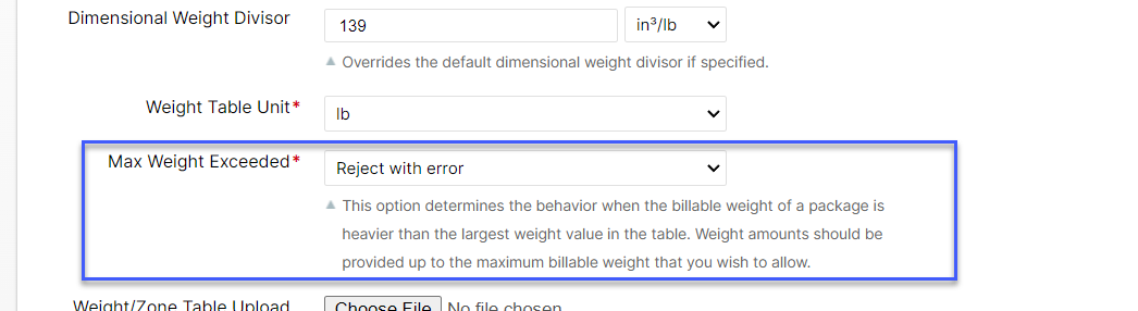 - Reject with error: An error with the message "The billable weight exceeds the highest value in the rate table." will be thrown to prevent the shipping method from being used.