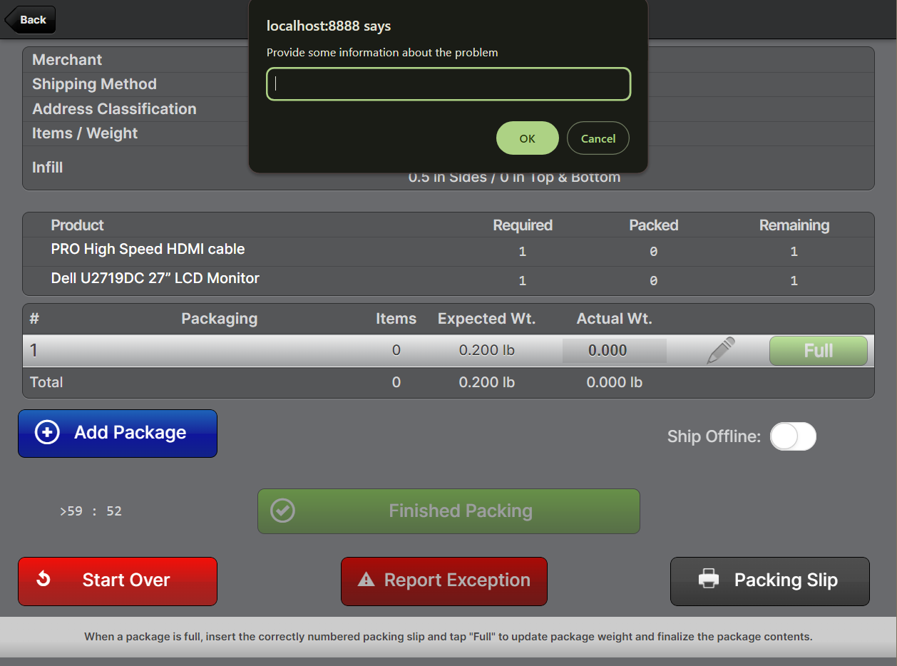 The Packing UI has gained a new "Report Exception" button which collects a comment from the user and changes the shipment status to the new "Packing Exception" status for easy reference. This new status and the user's comments are only visible to staff users, not client users. Use this new feature to improve your processes for handling pick errors, invalid addresses, and more.