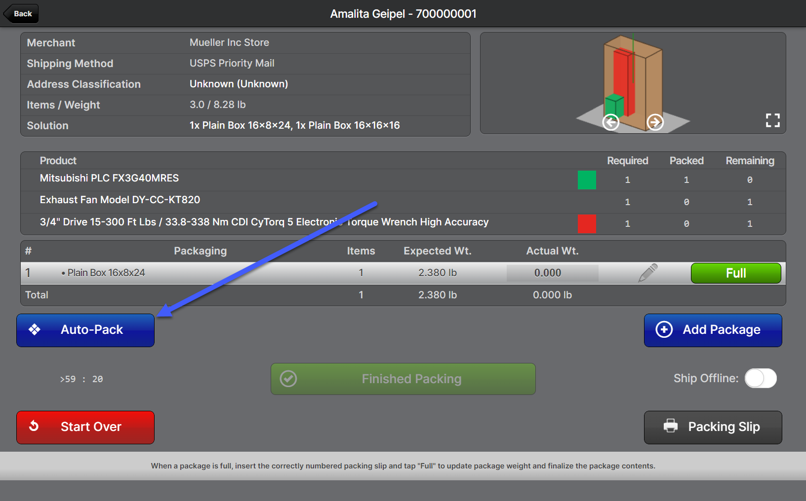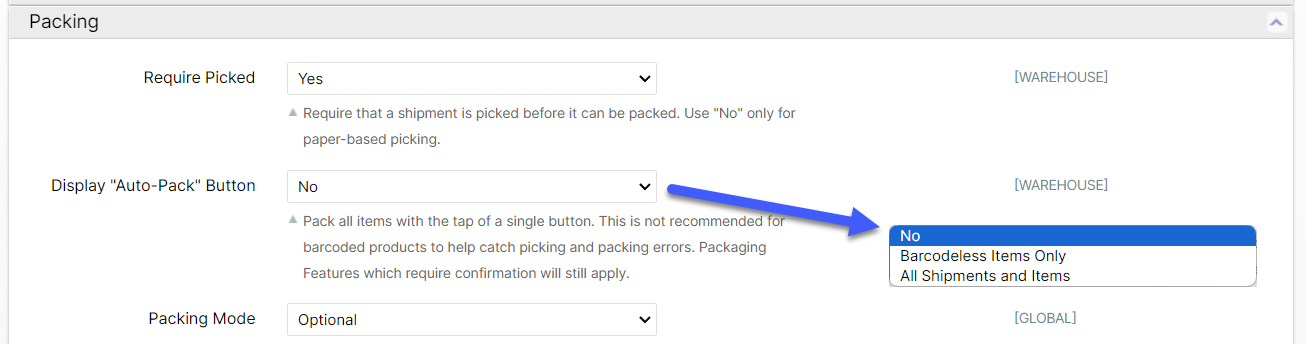 You can now more easily use the barcode-focused Packing UI for products that... lack barcodes with the new "Auto-Pack" button! The Packaging Features will still be applied as if you had scanned each barcodeless product, but now you can complete shipments of barcodeless products using the same user-friendly touch-optimized scanner UI.