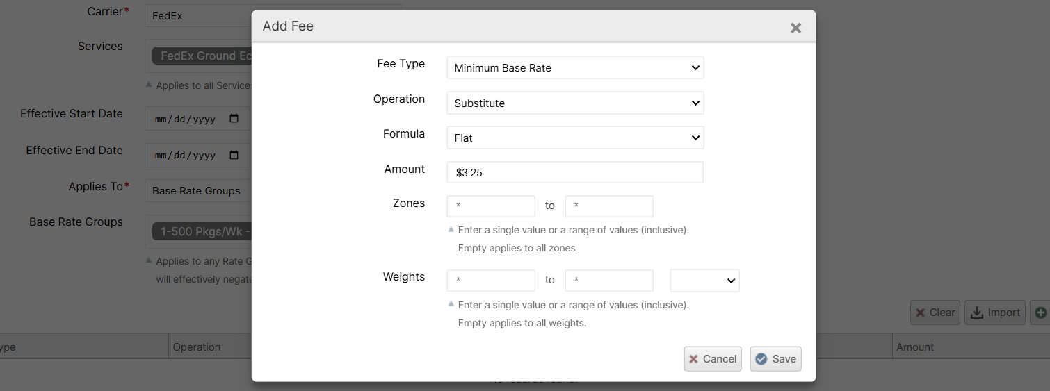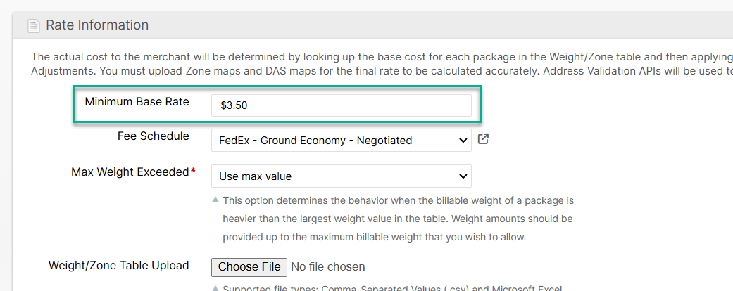 Carriers often have a minimum charge for a shipping service that is applied to their base rate. This can be "baked into" the rate tables, but by adding a separate field for it to the Rate Plan form, you can now use a single base rate table and apply the "Base Modifier" adjustments to it for each client while still respecting the Minimum Base Rate.