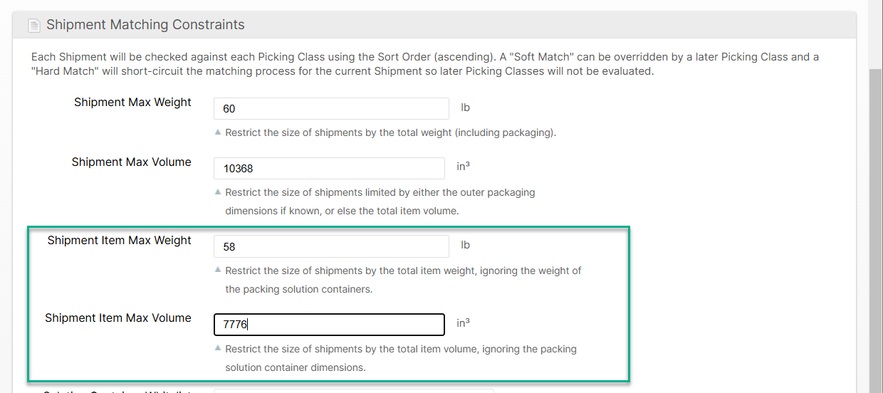The Picking Class constraints for maximum shipment weight and volume allow you to easily set size constraints for shipments to match your Picking Classes. However, shipments which require a large or heavy box and have a large percentage of void space could be unnecessarily excluded. The new Picking Class options Max Shipment Item Weight and Max Shipment Item Volume allow you to set these constraints exclusive of the packaging, which allow you to more closely match the shipment size limits to the true cart constraints.