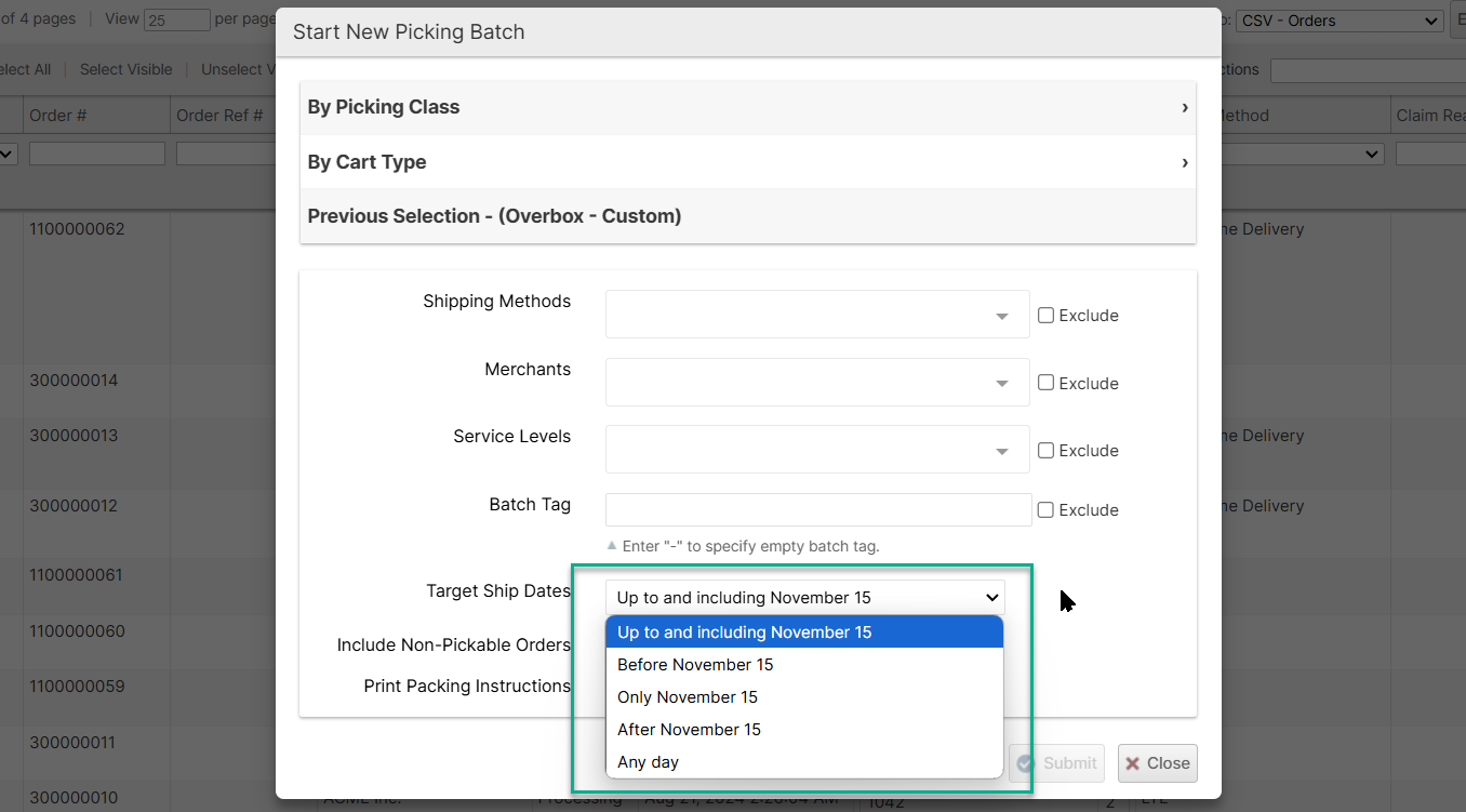 When creating a batch, you now have five options to choose from for filtering shipments by Target Ship Date instead of just two. For example, you can use the "After {today}" filter to start shipping the next day's orders without mixing them with the current day's orders.