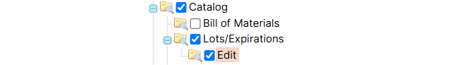 We relocated the Operation > Stock > Lots permission to Catalog > Lots/Expirations (to match the menu location) and added a new sub-permission for Edit so you can restrict editing lots while still allowing viewing of lots. This new permission is not required for inputting missing lot info while receiving or relocating inventory, only for updating existing lot information (which should arguably be a rare occurrence).