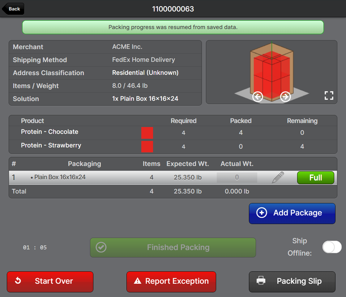 The Scanner UI for packing now auto-saves your progress, so you or a different user can resume it later by simply scanning the packing slip. The packages will be visible in the Admin UI and Client UI in "Packing" status with their saved contents, container data, weight, dimensions, etc.