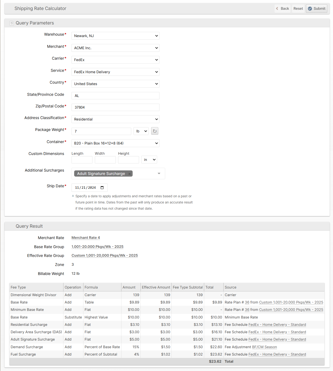 Gain fast and comprehensive introspection into your rating data with the new Rate Calculator tool. This tool provides a detailed breakdown of how a rate quote is derived from a set of inputs, including zone determination, calculated billable weight, application of fee adjustments and more.