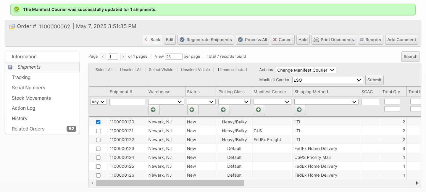 You can now change the Manifest Courier for a shipment using the mass actions on the Shipments tab. The Manifest Courier previously was set at the package level and therefore could not be set before the shipment was packed, but now you can set it before packing, as it is now set at the shipment level.