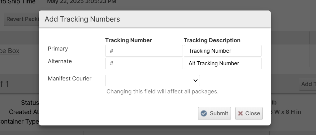 Similar to above, you can now change the Manifest Courier when adding tracking numbers. Additionally, you can change the tracking numbers after the order is packed but not yet shipped.
