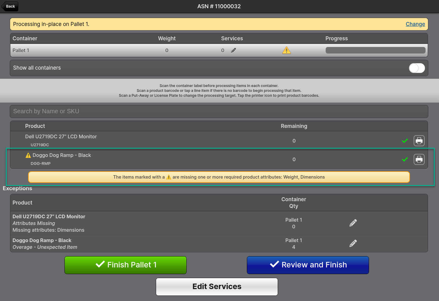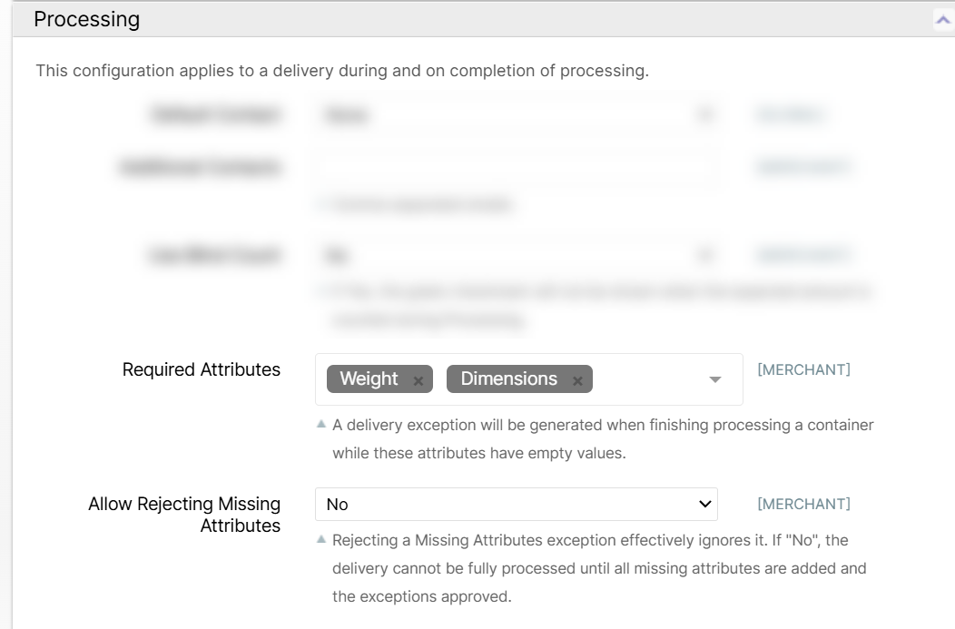 Enabling this feature will cause new elements to appear during processing to highlight products with missing attributes, and also create an exception which prevents completion of the delivery until they are set.