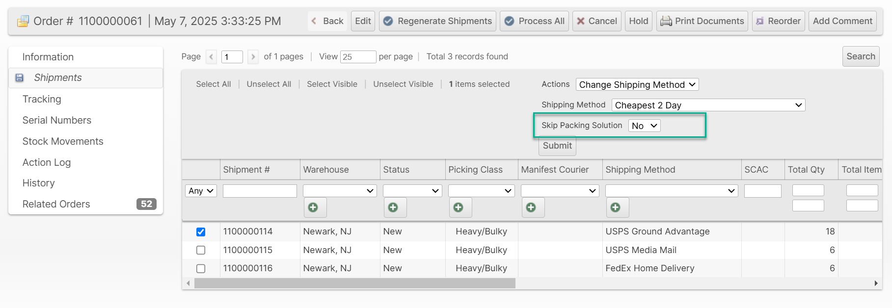 You can now specify to Skip Packing Solutions or not when changing the shipping method for a shipment. Specifying "No" will override the flag set if this was previously specified as "Yes" when using the Merge mass action.