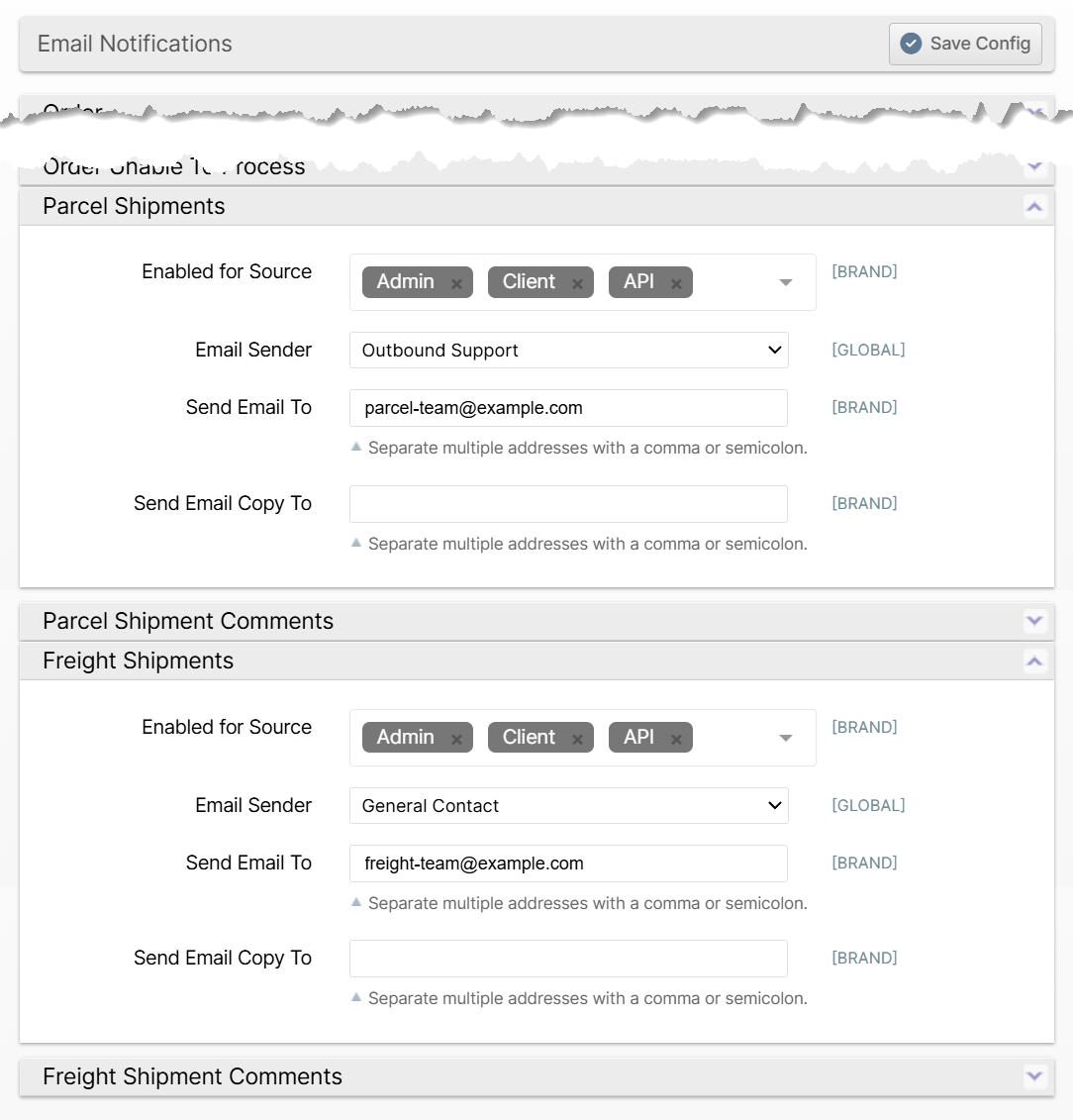 You can now configure your New Shipment and Shipment Comment email notifications separately for Parcel and Freight shipments which can be useful if you have separate responsible parties for each.