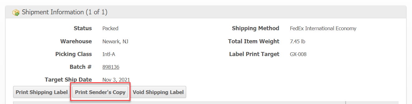 You may download or print the documents at any time by clicking "Print Sender's Copy" on the Shipment Information dialog on the Order page. If a printer is selected the file will automatically be sent to the printer, otherwise a PDF file will be downloaded.