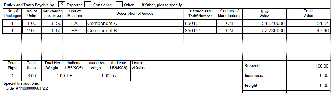 If the Component A product has a Customs Value of $60 and the Component B product has a Customs Value of $25, the sum of these values would be $110 ($60 + $25 + 25). This is different than the $100 value submitted with the order, but we don't want to over-pay duties and taxes so we instead will adjust each unit value by the proportional amount to the total so that the sum still equals exactly the submitted amount. In this case, the result would be like so: